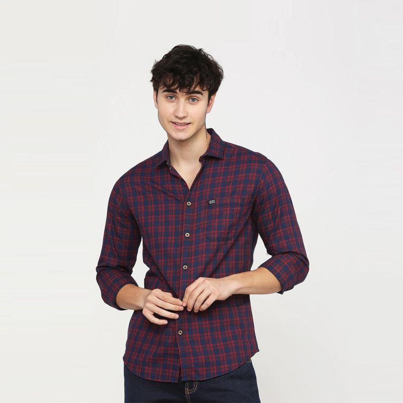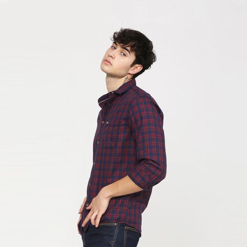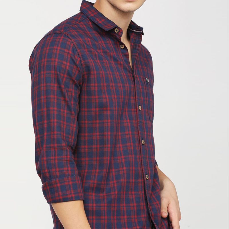قميص كاجوال باللون الأزرق الداكن والأزرق الداكن، ويحتوي على ياقة واسعة، وأكمام طويلة، وأزرار ضيقة، وحافة منحنية، وجيب 1 رقعة.