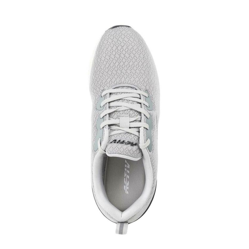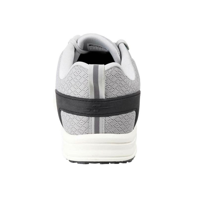 زوج من أحذية المشي الرمادية، وتصميم منتظم، وتفاصيل الأربطة