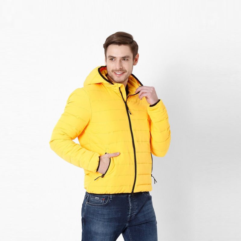 سترة منتفخة مخططة باللون الأصفر ، لديها غطاء رأس ، جيوب 2 ، لديها إغلاق بسحاب ، أكمام طويلة ، حاشية مستقيمة ، بطانة من البوليستر.
