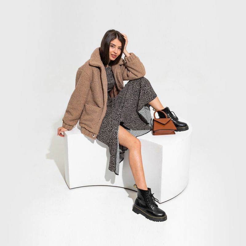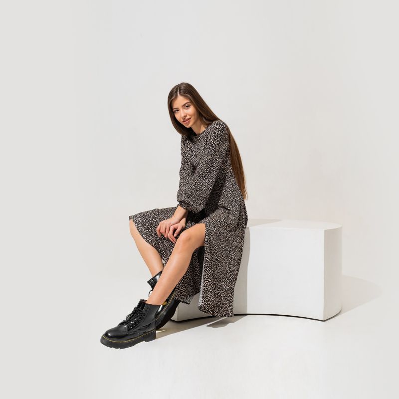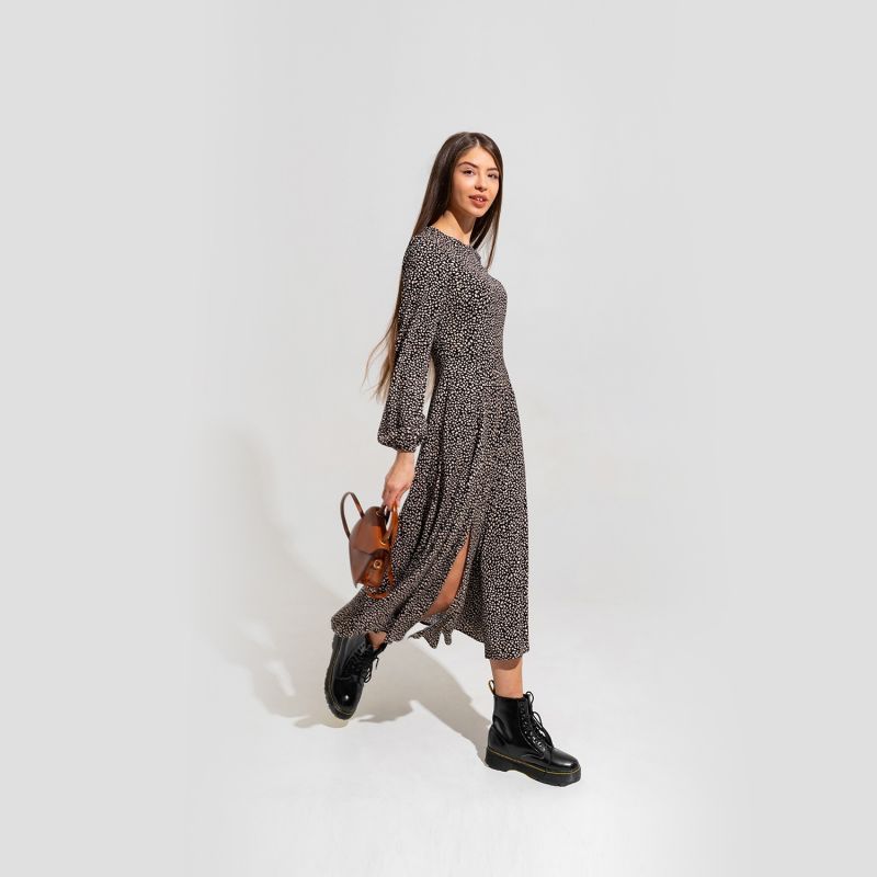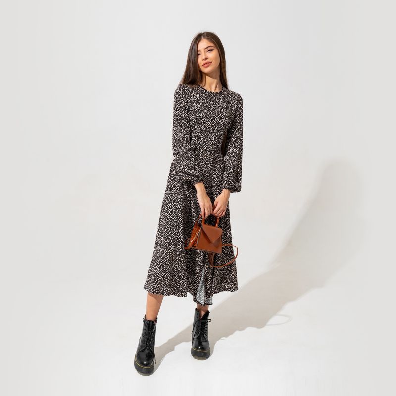 Black dress with white dotted prints, has a round neck,  three-quarter sleeves.