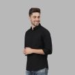 Black solid casual shirt, has a spread collar, button placket, and curved hem