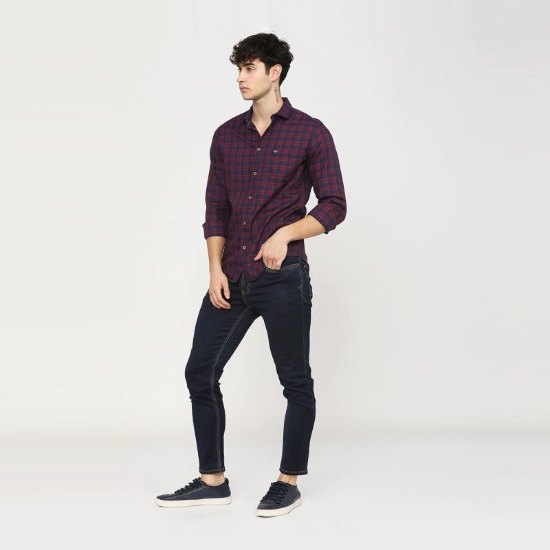 Maroon and Navy Blue checked casual shirt, has a spread collar, long sleeves, button placket, curved hem, and 1 patch pocket.