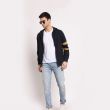 Blue solid varsity jacket, has a stand collar, two pockets, zip closure, long sleeves, straight hem, cotton lining.