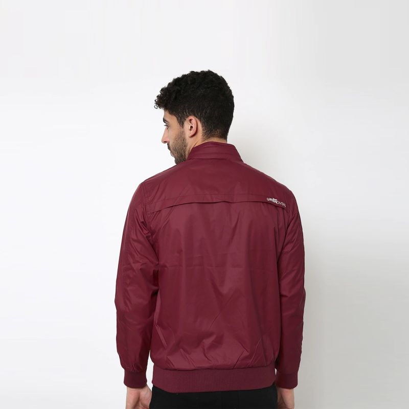 Solid puffer jacket, has a mock collar, 2 pockets ,has a zip closure, long sleeves, straight hemline, polyester lining.