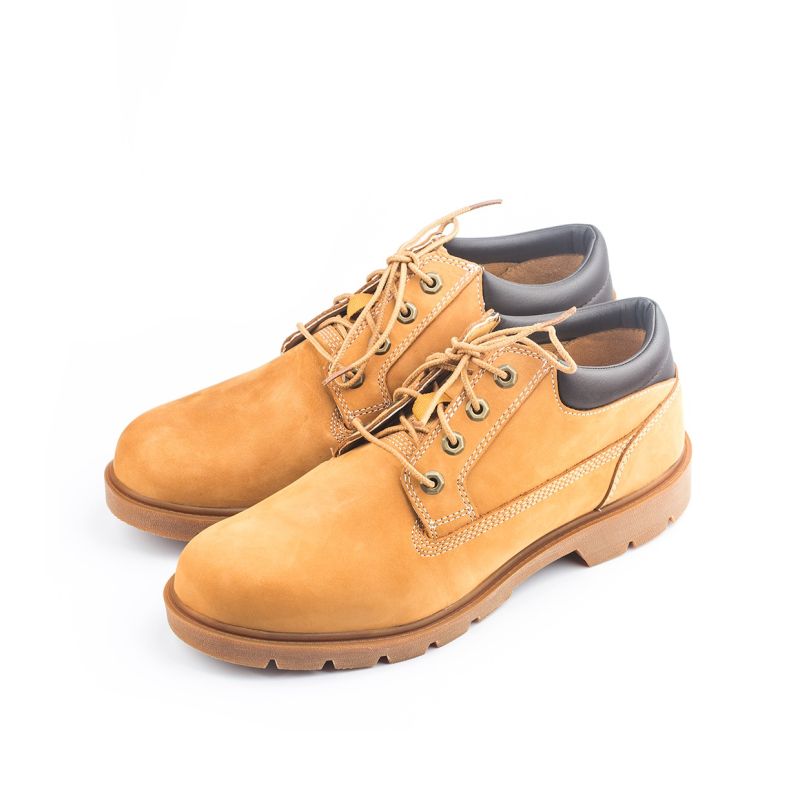 A pair of round-toe Yellow Boots, has regular styling, lace-up detail