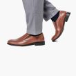A pair of brown textured round-toe formal slip-ons has regular styling, with slip-on closure
