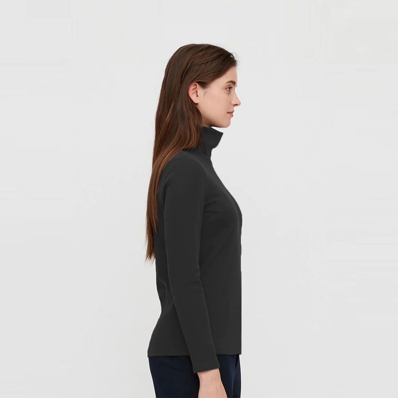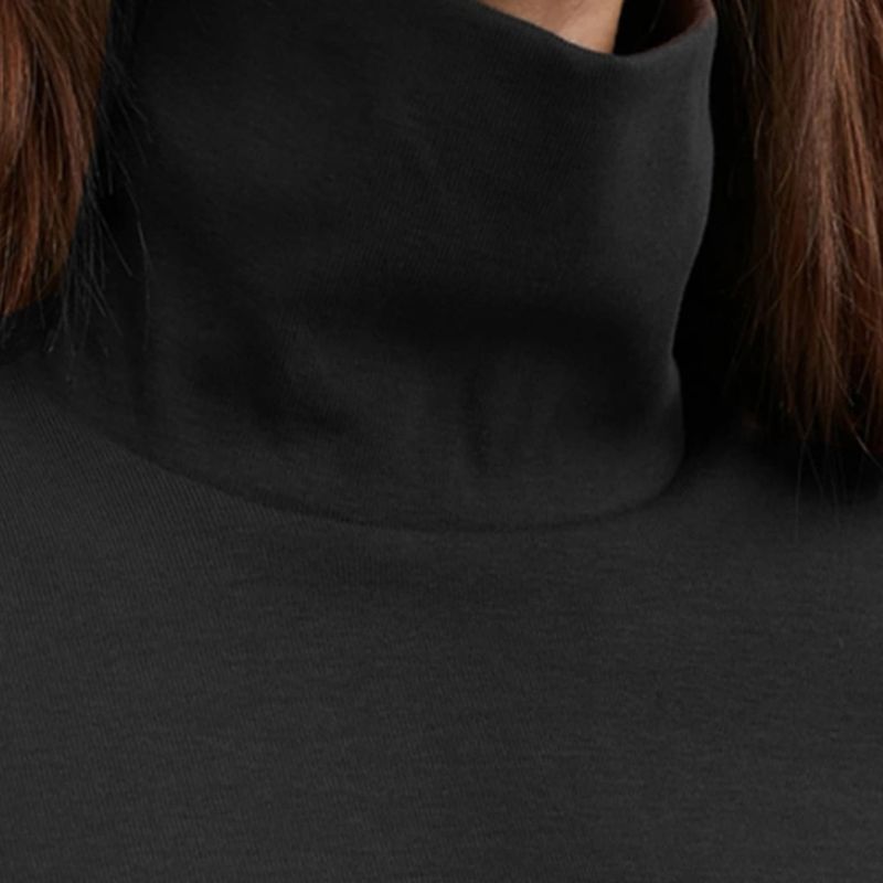 Black solid T-shirt, has a turtle neck, and long sleeves.